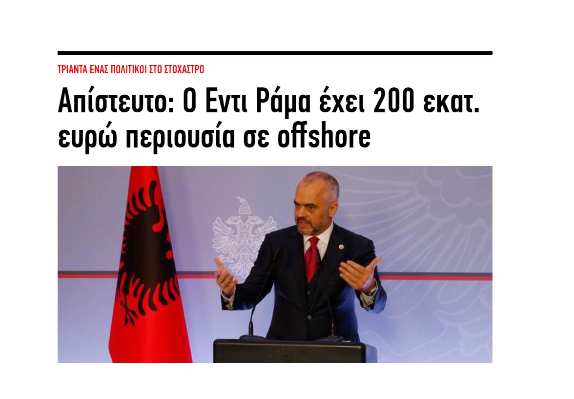 “Edi Rama (PS): Kryetar i PS, Kryetar i Bashkisë së Tiranës 2000 – 2011 dhe tani Kryeministër. Është folur shumë në lidhje me dyshimet për përfitimin e një tarife për lejet e ndërtimit, me rreth 10 – 20 % të vlerës së ndërtesave. Shumë i kujdesshëm për të operuar nëpërmjet personave të tretë, ai ka mohuar vazhdimisht çdo përfshirje në korrupsion apo krime. Pasuria e tij përflitet të jetë rreth 200 milionë euro, të investuara në kompani “offshore” përmes vëllait të tij, Olsit, në Shtetet e Bashkuara të Amerikës”, shkruan gazeta greke iEfimerida.