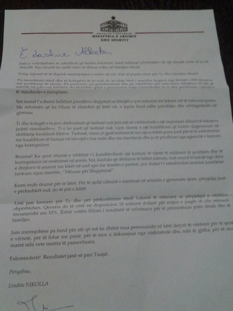 Së pari, do të dëshiroja të më drejtoheshit me “zonja Alketa” dhe aspak “e dashur Alketa” , sepse në këto tre-katër vite, “reformat” tuaja arsimore, jo vetëm nuk më kanë qenë të afërta dhe të kujdesshme sa komunikimi ynë të ishte i llojit personal e shoqëror, por përveç stresit që më kanë sjellë (siç e pohoni edhe vetë), më kanë zvjerdhur përfundimisht shpresën se në këtë vend mendon dikush për të vlerësuar moralisht e materialisht profesionistët dhe intelektualët.