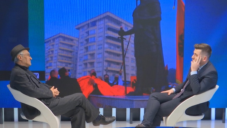 Sipas Albes me zamete dhe te ftohur ngambrapa, Skenderbeun duhet ta paraqesim me nje kembe ne varr. Une them ta bejme kur ishte dy vjec. Si tha pastaj, nuk eshte resme. Domethene, ngjan nuk ngjan, ç’i q… tëmën, ç’rëndësi ka. E c’traplliqe degjon. Skenderbeu ka qene trupmadh, e thote një studiues serioz si Plasari.