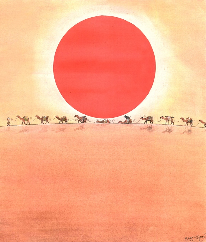 Ky imazh i fotografuar nga George Steinmetz është konsideruar si një ndër më të mirët e vitit 2005. Qysh atëherë është përdorur në kopertinën e NG versioni turk në një shkrim mbi shkretëtirat dhe në shumë revista të tjera dedikuar udhëtimeve, natyrës dhe shkencës. Imazhi krijon iluzionin e gamiljeve të para horizontalisht, por në fakt është fotografuar pingul mbi to. Hijet e gamiljeve që zgjaten në perëndim janë më të dukshme sesa kafshët vetë që përzihen me ngjyrën e rërës. Fotoja është shkrepur në Oman. George Steinmetz fluturon me një velë me motor e cila peshon 45kg.