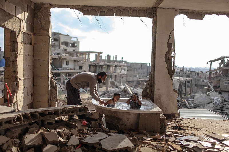 Është një foto e shkrepur në Palestinë pak kohë më parë. Salem Saudi, 30 vjeçar lan të bijën dhe mbesën në të vetmen pjesë të pashkatërruar të shtëpisë. Vaska është një ndër orenditë e pakta të mbetura dhe babi di sesi t’i bëjë vajzat të buzëqeshin edhe në mes të tmerrit të luftës.
