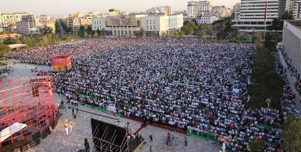 Besimtarëve myslymanë dhe gjithë shqiptarëve, urime për paqe, bashkëjetesë dhe vëllazëri. Në foto, besimtarët myslimanë që bënë lutjen e mëngjesit të festës së Bajramit të madh, pas muajit të Ramazanit.