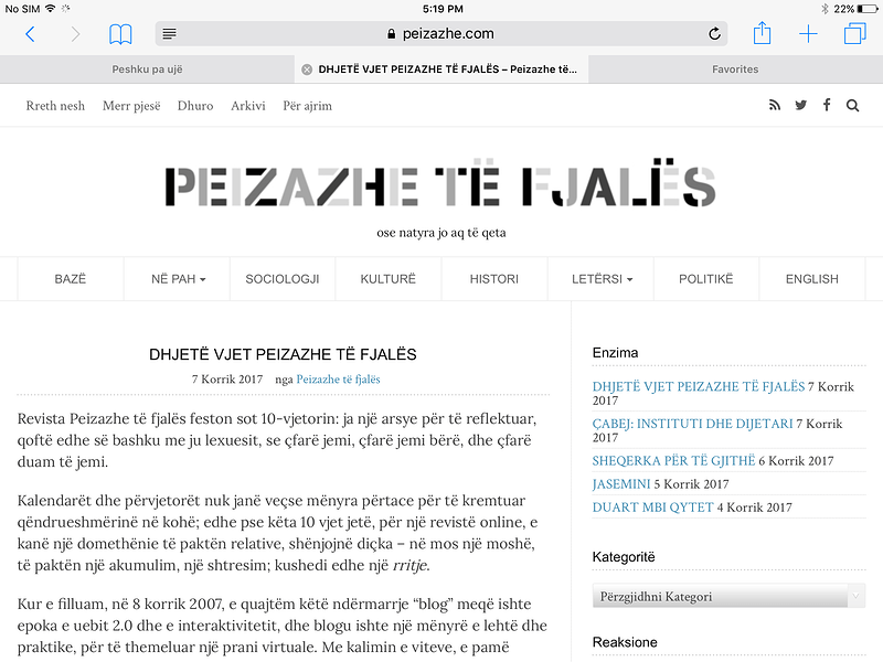 Publikimi per 10 vjet i nje botimi ne shqipe dinjitoze si dhe perpjekja e qarte per te ruajtur pastertine e gjuhes Shqipe mes amullise se tallavave nga kontribuesit e Peizazheve eshte nje akt i mirefillte patriotik. Vebiu si cdo njeri mund te kete preferenca individuale qe nuk zbehin thelbesoren tek ai, punen per nje Shqipe te bukur e te paster.