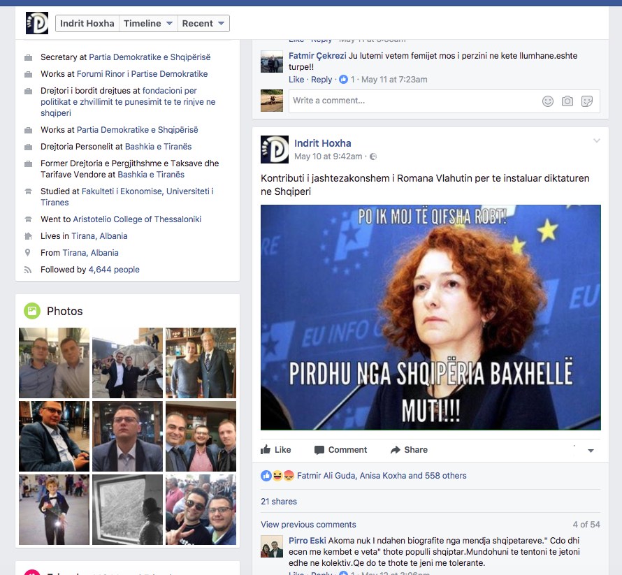 Personi në fjalë ra në sy për shkak të mesazheve të ngarkuara me zemërim dhe misogjini që shpërndante (dhe ende mban) në Facebookun personal. Sot Indrit Hoxha është kandidat i Partisë Demokratike për Tiranën. Gra si Majlinda Bregu dhe burra si Eduard Selami mungojnë, por ky personazh i ri, Facebook i të cilit ulëret “Adoleshencë!!” është në ofertë. Basha thotë se nuk i heq asnjeë presje listës “fituese”. PD është gjobitur nga KQZ për mos përmbushjen e kuotave të grave në disa qarqe, ndërsa urrejtjen ndaj grave, së paku ky kandidat e valvit me krenari. Ky postim ku Hoxha përpiqet (pa sukses, natyrisht) të poshtërojë ambasadoren e Bashkimit Europian është më popullori që ai ka në rrjetin social.