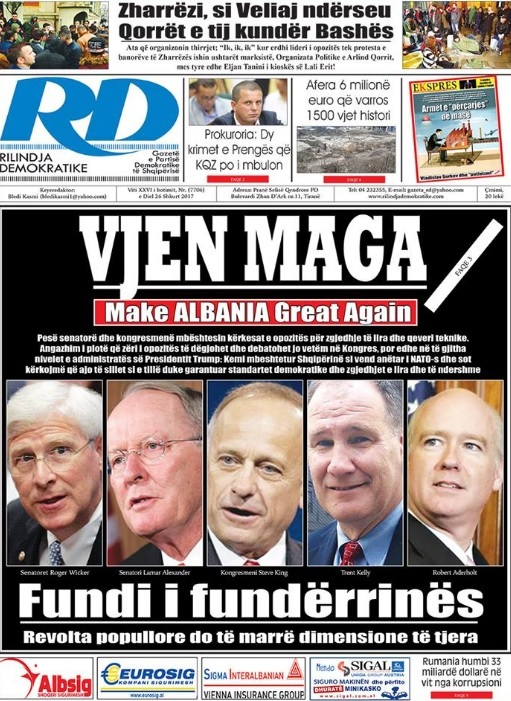 Gjashtë senatorë dhe kongresmenë shprehin mbështetjen e plotë të kërkesave të popullit shqiptar për zgjedhje të lira dhe të ndershme përmes një qeverie teknike. Ata do të angazhohen gjatë ditëve të ardhshme për një fushatë të fortë në Senatin dhe Kongresin amerikan, por edhe në të gjitha nivelet e administratës së Presidentit Trump për të ndërgjegjësuar Shtetet e Bashkuara nga rreziku që ka sot Shqipëria për të rënë në kthetrat e mafias dhe krimit të organizuar përmes fundosjes së mekanizmit të zgjedhjeve të lira.