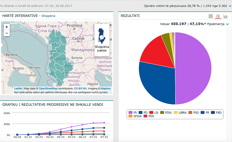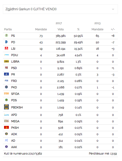 Faqja e KQZ-së cec.org.al tashmë funksionon ndaj në këtë hapësirë do mund të raportojmë mbi numrat zyrtarë të rezultateve të zgjedhjeve parlamentare 2017. Me votat e numëruara deri tani vihet re se Partia Socialiste ka më shumë vota nga partitë e tjera në çdo qark përveç Kukësit ku kryeson PD.