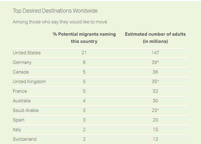 Sondazhi, i kryer në vitet 2013-2016 në 156 vende të botës pyet njerëzit mbi 18 vjeç, pra në moshë madhore, nëse duan të migrojnë në një vend tjetër, dhe nëse po, cili do ishte ai vend. 14% e popullsisë globale, që përkthehet në 710 milionë njerëz, duan të largohen nga vendi i tyre.