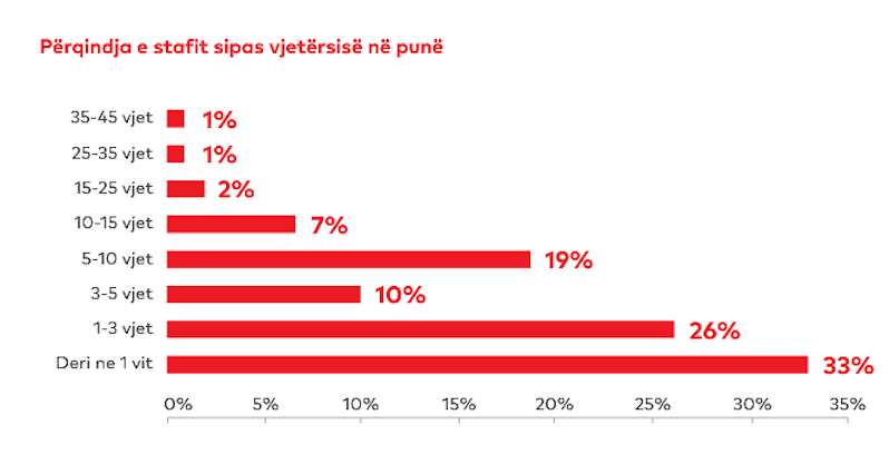 Grafiku më sipër na tregon se në televizionet, vetëm 11% e stafeve kanë mbi 10 vjet punë, shifra është e ulët, përtej faktit që televizionet shiptare private janë rreth 15 vjeçare. Mosha e re e televzioneve nuk justifikon faktin se 59% e të punësuarve kanë 3 ose më pak vjet në vendin e punës, ndërsa 33% janë në atë vend pune nga 0 deri në 1 vit. Pra 1 në 3 punonjës sapo ka nisur punë në atë pozicion, dhe me gjasa sapo ka nisur edhe karrierën (53% e të punësuarve në televizione janë nën 35 vjeç).